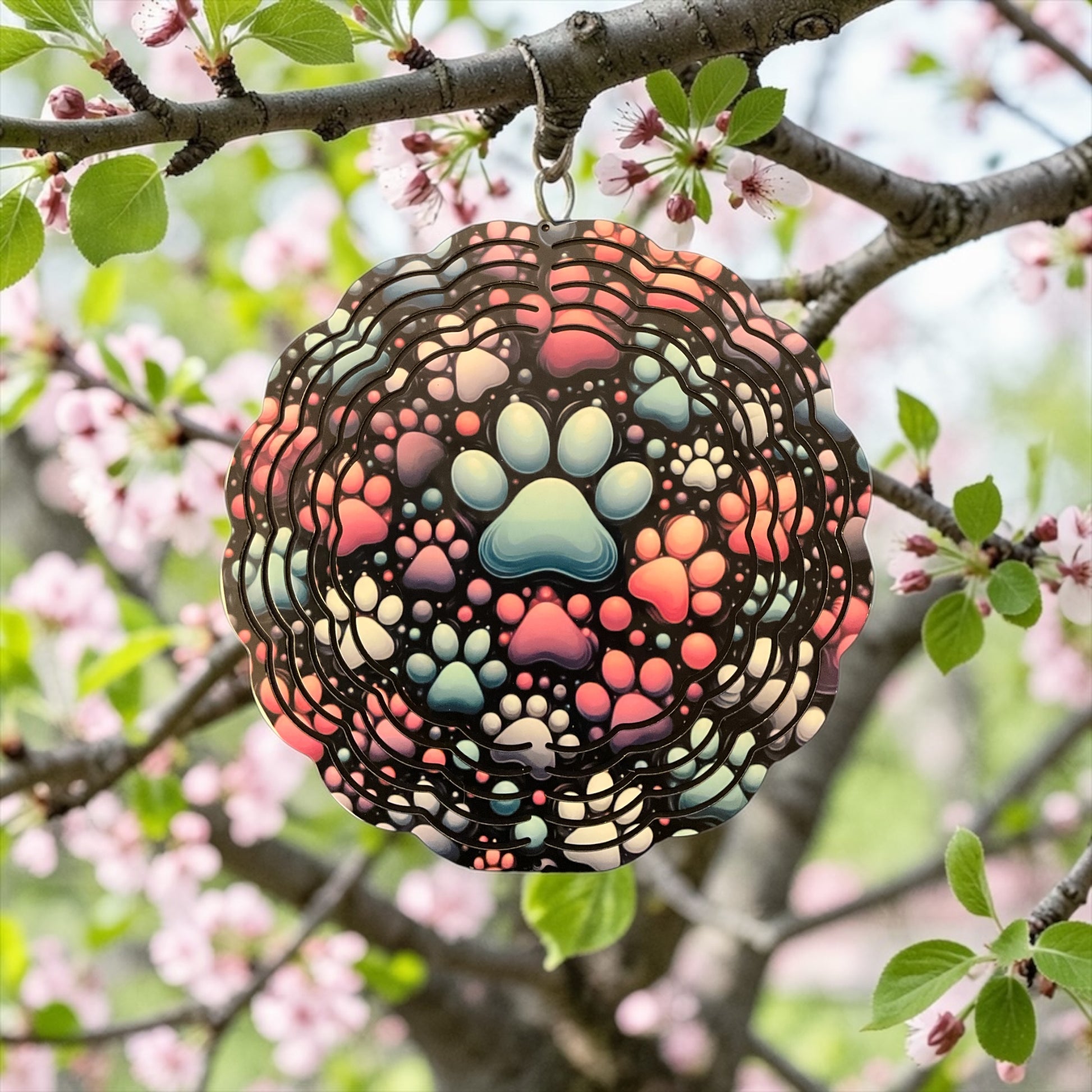 The 8-inch puppy paws wind spinner is designed to enhance outdoor aesthetics with its vibrant colors and playful motif. Its lightweight construction allows for optimal movement in light breezes, effectively adding kinetic charm to gardens or patios. This decorative piece can withstand various weather conditions, promoting durability and longevity.